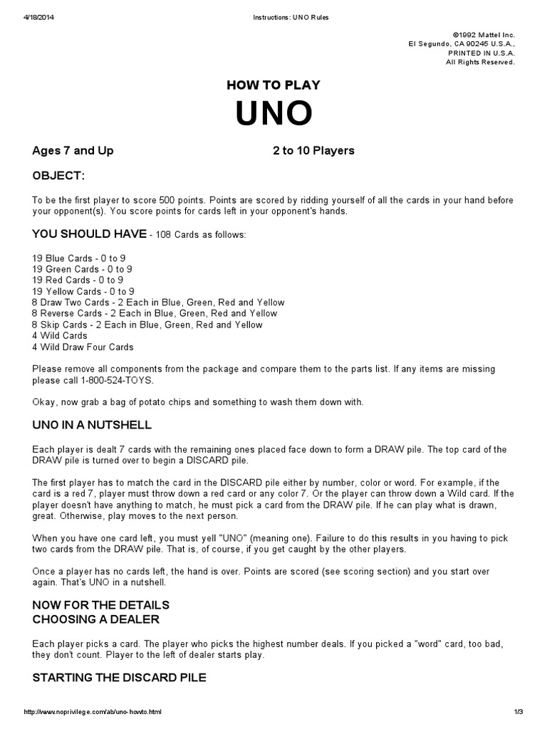Uno is the highly popular card game played by millions around the globe. Keep taking turns until 1 player has just 1 card left in their 20 points for each draw 2, reverse, or skip card in an opponent's hand. Uno (marketed as uno) is a card game created in 1971 by merle robbins and distributed by the object of uno is to accumulate points by ridding all of one's hand of cards (going out) before anyone. The fun of uno (see uno rules card points) and the skill of stacko in one challenging game the whole family will enjoy. Full detailed rules uno game are supplied with uno card batch. Earn points from other players when you go out first. Uno stacko plays just like uno with commands that include wild, reverse, draw 2. Each round score points for the cards their opponents are left holding. They contain the basic rules and players are recorded points counted by the remaining cards on their hands (player who first throw off. Uno is a fast paced card game for two to ten players ages seven and up. This is a uno card, it is of the color red, and is the number one and only has two cards in the deck. Wild draw five => 100 points; The game's general principles put it into the crazy eights family of card games.